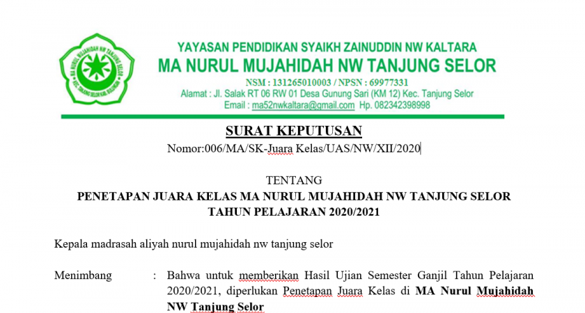 SK Penetapan Juara Kelas MA Nurul Mujahidah NW Tanjung Selor