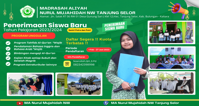Assalamualaikum wr wb. Pada Tahun 2020 ini. Madrasah Aliyah Nurul Mujahidah NW Tanjung Selor Kembali Menerima Peserta didik baru Untuk di didik dan dibina di Madrasah Kami